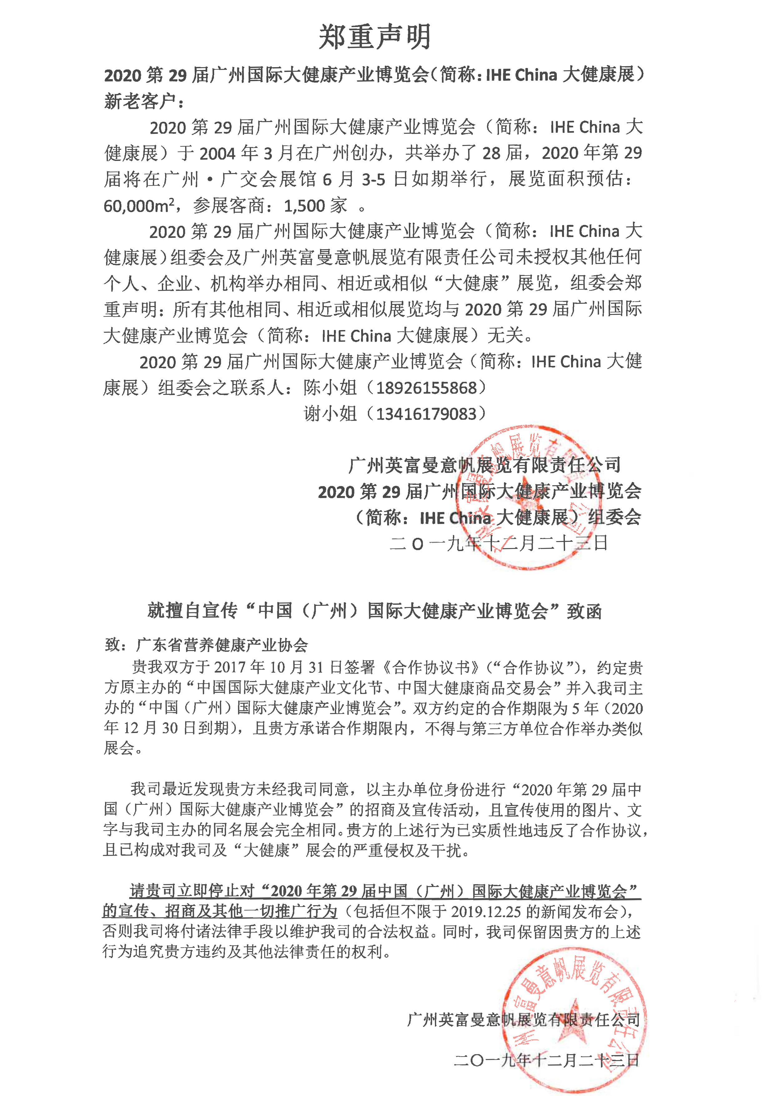 【鄭重聲明】就擅自宣傳“中國(廣州)國際大健康產業博覽會”致函