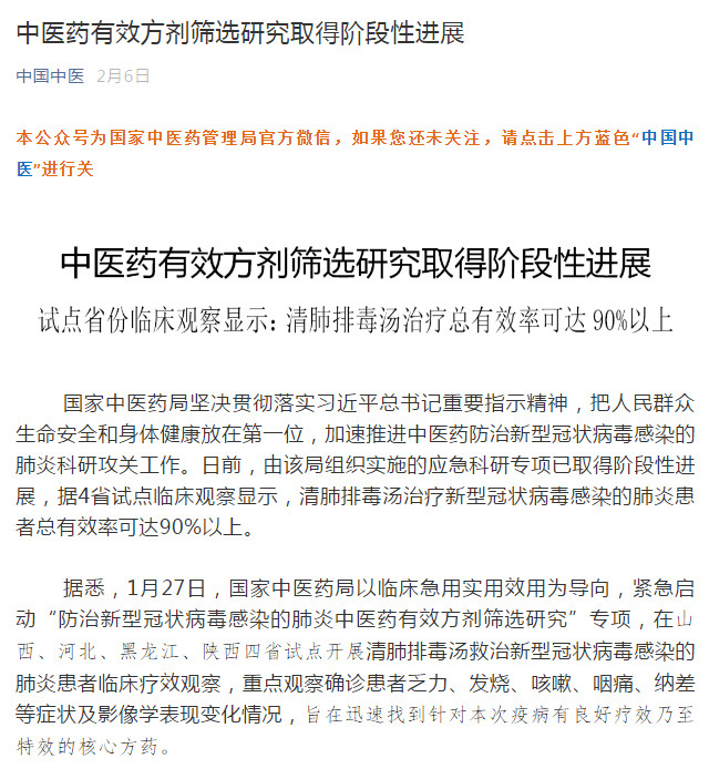疫情后,全民對中醫(yī)藥的信任度和使用大幅度提高。2月6日,國家中醫(yī)藥管理局官網(wǎng)發(fā)布了《中醫(yī)藥有效方劑篩選研究取得階段性進(jìn)展》。