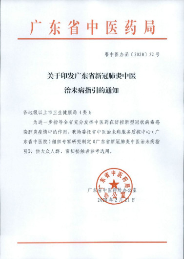2020年2月21日,廣東省中醫(yī)藥局印發(fā)《廣東省新冠肺炎中醫(yī)治未病指引》。