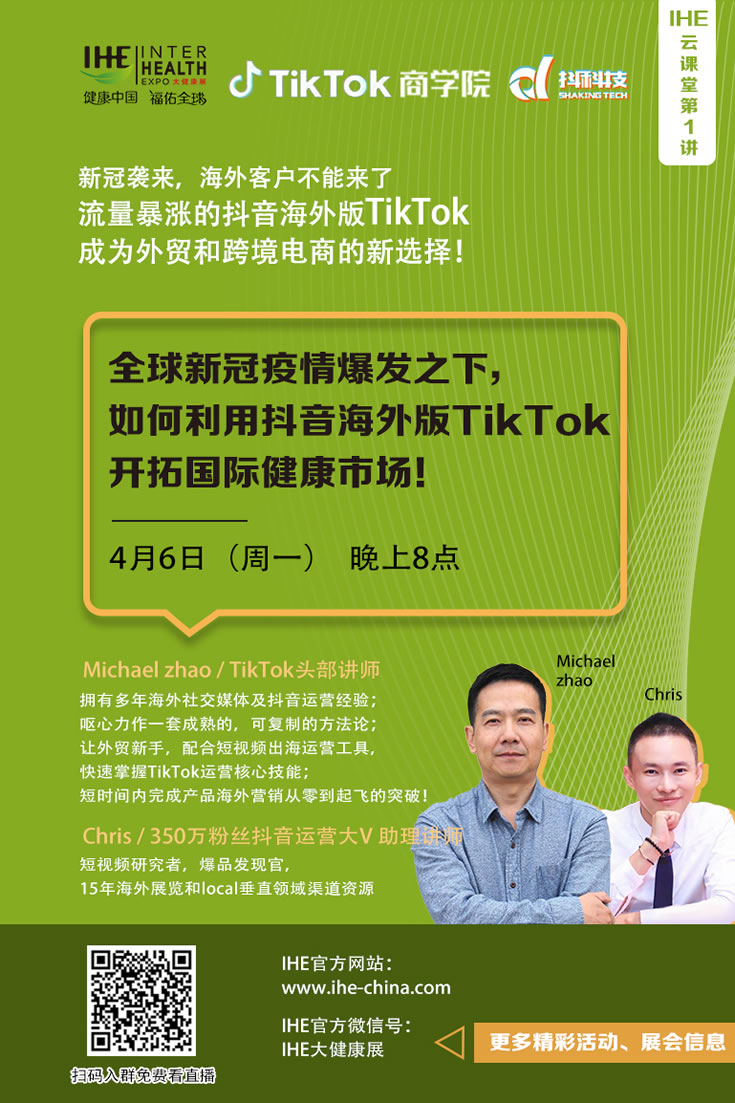 4月6日(周一)晚八點!TikTok頭部講師Michael Zhao做客IHE China大健康云課堂!帶領大家了解“在全球新冠疫情爆發之下,如何利用抖音海外版TikTok開拓國際健康市場!”