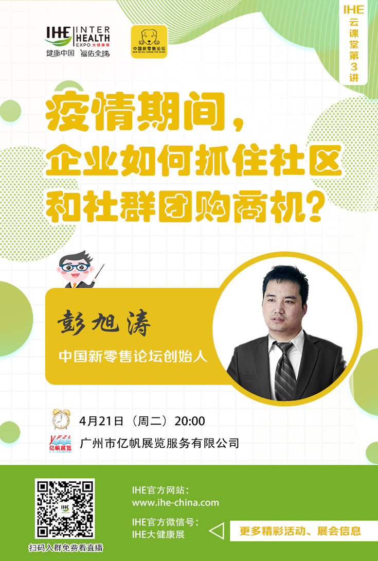 4月21日晚上8點,IHE China大健康展云課堂第3講,特邀新零售論壇創始人彭旭濤做客直播間,經由實戰案例,剖析社區團購的興起與邏輯,展望社區團購的未來,帶來獨家解讀:“疫情期間,企業如何抓住社區和社群團購的商機?”,為企業接下來布局后疫情期,提供可資借鑒的方法論與思想干貨。