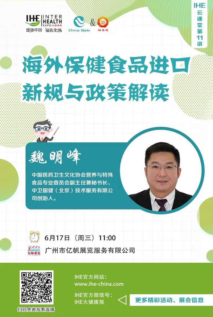IHE China大健康云課堂每周邀請行業資深專家授課,分享行業干貨,多維度解決客商痛點。本期有幸邀請到中國醫藥文化協會營養營養與特殊食品專業委員會副主任兼秘書長、中衛國建(北京)技術服務公司創始人魏明峰先生做客云課堂直播間,給大家帶來“海外保健食品進口新規與政策解讀”。掃描下方二維碼免費觀看精彩回放!