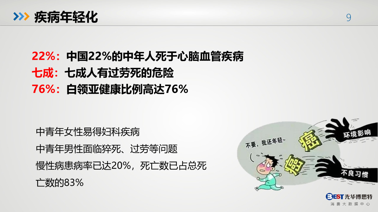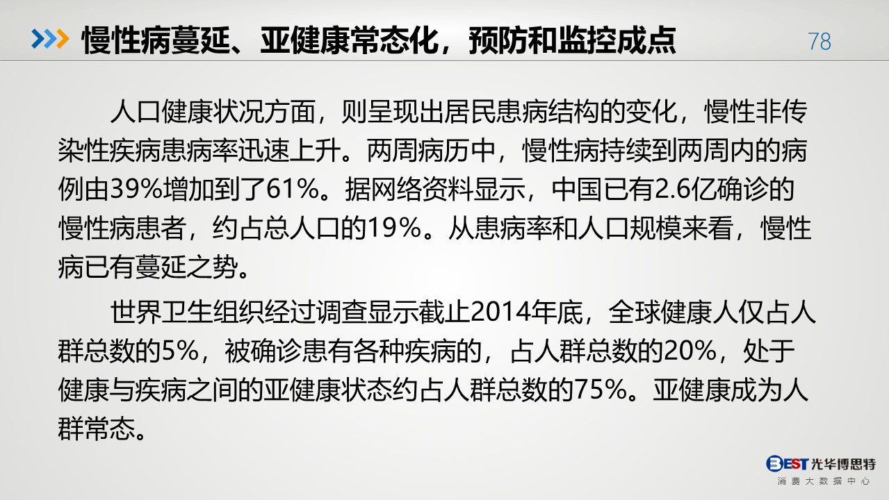 雖然國民健康問題嚴峻,但隨著消費升級、健康意識的提高利好大健康行業各領域的發展,先后經歷 “基本消費”向“高層消費”的轉變。創新是引領發展的第一動力,創新更是大健康行業持續發展的生命源泉。在疫情影響下的2020,大健康行業更應抓住此次機會,充分理解健康理念,為消費者帶來更好的體驗。