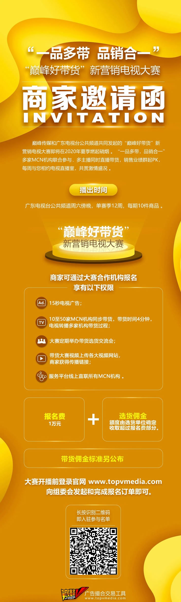 巔峰好帶貨-新營銷電視大賽,采用創新性的ROI模式來執行和運營。同時,大賽的交易工具巔峰V,為各方提供優質的撮合、訂單、存管、分賬服務。通過電視直播形式,借助媒體公信力和大屏流量池,向MCN機構賦能,聯合為商家提供“品銷合一、集群式帶貨”服務,力求達到多方共贏的局面。