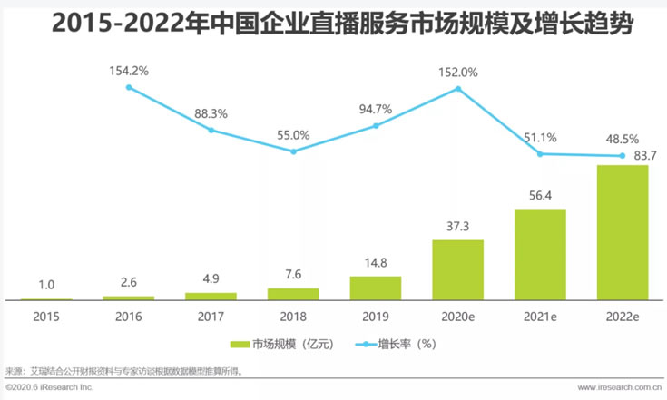 據艾瑞咨詢官微發布的企業直播分析報告顯示,中國企業直播服務進入發展快通道,2019年突破十億大關,市場收入規模達到14.8億元人民幣。2020年新冠肺炎疫情使得企業直播迎來第二波發展機遇,預計2020年企業直播服務市場有望達到35億以上的市場規模。