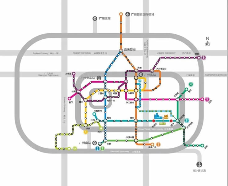 3號線(北延長線)機場北站(2號航站樓)/機場南站(1號航站樓)- 體育西路站(轉乘3號線) - 客村站(轉乘8號線)- 新港東站(廣交會展館A區)。