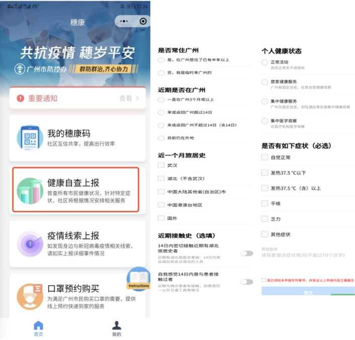 點擊首頁“我的穗康碼”,點擊“上報健康信息”,填寫用戶健康自查信息,包括基本信息、人員類型、是否有湖北旅居史、是否有如下癥狀、詳細(xì)描述等信息。疫情防控關(guān)鍵時期,請務(wù)必如實填寫。