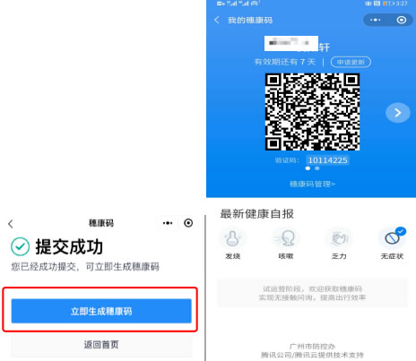 4. 點擊“提交”,提交后點擊“立即生成穗康碼”。提示如下: