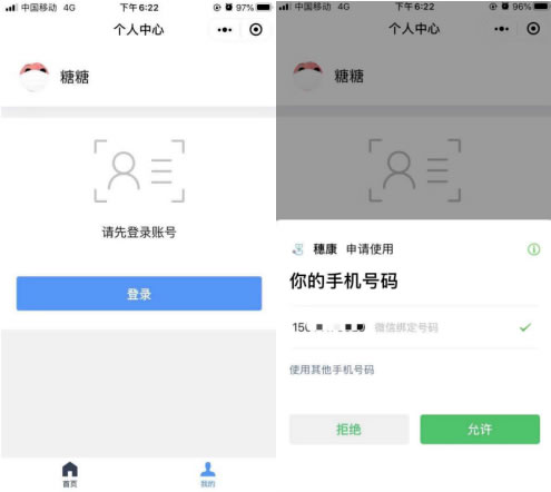 2. 初次登錄的通行人員,需綁定微信賬號,進入“穗康”小程序后點擊“我的”,登錄并授權綁定手機號碼。