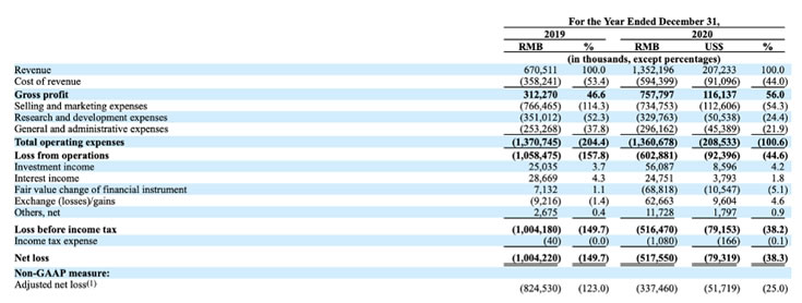 那么,這樣一家稀缺的互聯網公司,要如何撐起一個IPO?招股書顯示,知乎2020年總營收為13.52億,相比2019年營收6.71億,同比增長101.7%;全年毛利為7.58億,同比增長142.7%;全年毛利率為56%,同比增長20.2%。