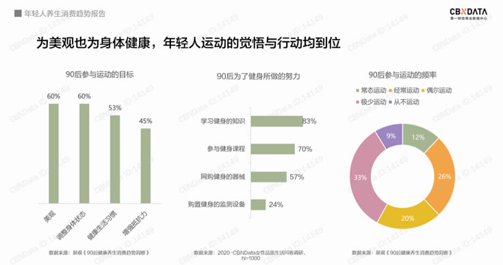加上受今年疫情影響,年輕人養(yǎng)生意識空前上漲,消費者的健康理念和消費理念全面升級,年輕人不再只是注重美食、服飾、電子、娛樂等方面,而是更多地關(guān)注與健康、養(yǎng)生強(qiáng)相關(guān)的產(chǎn)品。根據(jù)報告,目前九成以上90后已有養(yǎng)生意識,超半數(shù)90后已經(jīng)走在養(yǎng)生的路上。