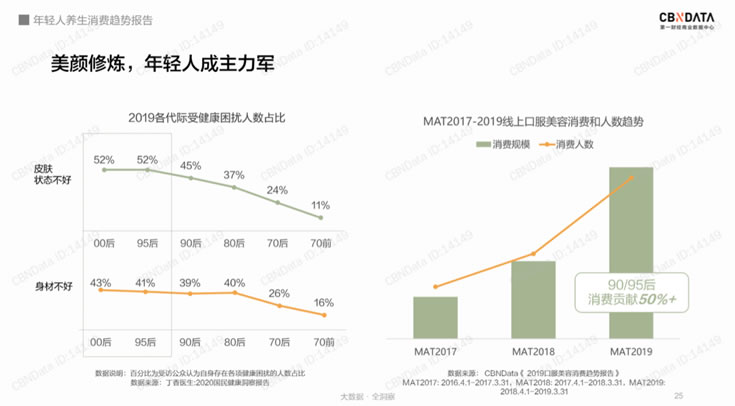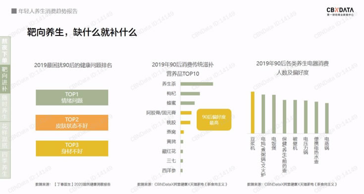 根據(jù)CBNData《年輕人養(yǎng)生消費趨勢報告》(以下簡稱“報告”)顯示,我國半數(shù)以上的90后有脫發(fā)、掉發(fā)、視力減弱的困擾,同時約有四成90后有肥胖、運動能力下降的情況,還有三成出現(xiàn)了免疫力下降的問題。“三十而立”的90后們,正積極加入“養(yǎng)生大軍”。