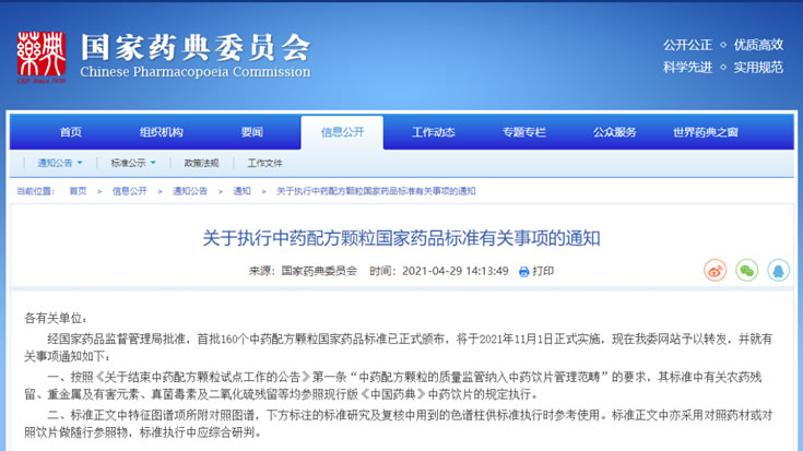 2021年4月29日,國家藥典委員會發(fā)布《關(guān)于執(zhí)行中藥配方顆粒國家藥品標(biāo)準(zhǔn)有關(guān)事項的通知》,并隨文轉(zhuǎn)發(fā)了國家藥監(jiān)局發(fā)布批準(zhǔn)頒布的第一批160個中藥配方顆粒國家標(biāo)準(zhǔn),標(biāo)志著在2019年11月5日頒布的《關(guān)于中藥配方顆粒品種試點統(tǒng)一標(biāo)準(zhǔn)的公示》之后,我國終于迎來了中藥配方顆粒國家標(biāo)準(zhǔn)的落地實施。經(jīng)過近二十年的中藥配方顆粒試點生產(chǎn),從生產(chǎn)企業(yè)到國家標(biāo)準(zhǔn)管理部門,對制定中藥配方顆粒標(biāo)準(zhǔn)進(jìn)行了大量的研究和討論,我國的第一批160個中藥配方顆粒國家標(biāo)準(zhǔn)終于成功頒布落地,并將于2021年11月1日起正式實施。