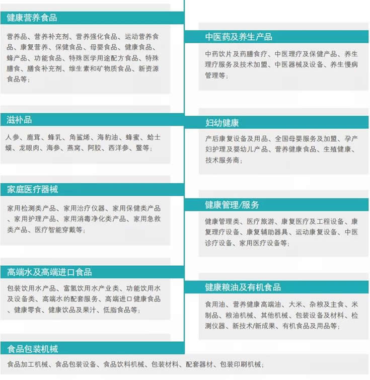 IHE China是以全產業鏈、全題材為鮮明特色的大健康產業博覽會。展示內容涵蓋健康營養食品、中醫藥及養生理療、滋補品、婦幼健康、家庭醫療器械及健康管理、高端水及高端食品、健康糧油及有機農產品、食品包裝機械等十余個專業領域,匯集上千家全球領軍品牌帶來的上萬種健康產品。