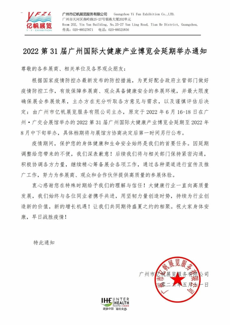 根據國家疫情防控辦最新發布的防控措施,為更好配合政府主管部門做好疫情防控工作,有效保障參展商、觀眾具備健康安全的參展環境,并最大限度確保展會參展效果,主辦方在充分聽取各方意見與需求,以及謹慎評估后決定:由廣州市億帆展覽服務有限公司主辦,原定于2022年6月16-18日在廣州·廣交會展館舉辦的2022第31屆廣州國際大健康產業博覽會延期至2022年8月中下旬舉辦,具體檔期將與展館方協商決定后第一時間另行公布。