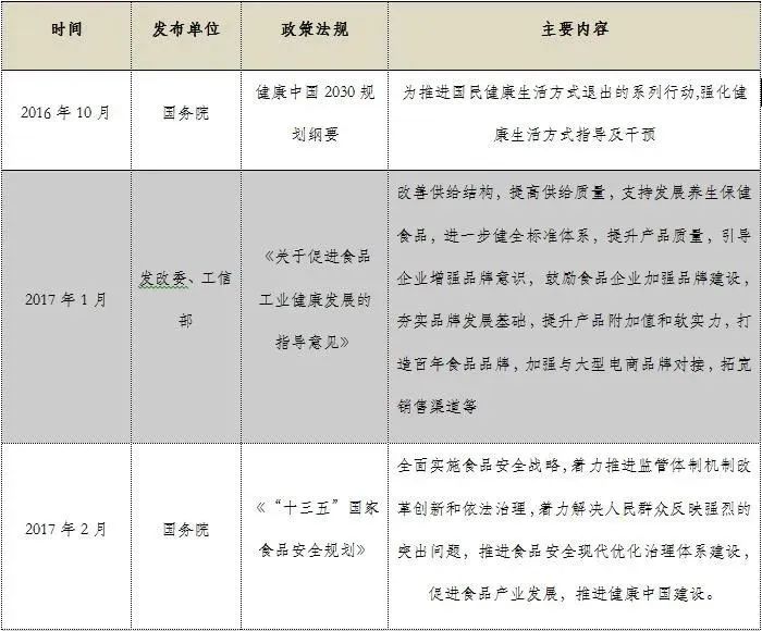 2015 年,十八屆五中全會公報中,將建設“健康中國”上升為國家戰略;2017年黨的十九大報告將實施健康中國戰略納入國家發展的基本方略,指出“人民健康是民族昌盛和國家富強的重要標志”,群眾健康的受重視程度不斷提升,健康中國建設進入全面實施階段。由于食品安全仍然是首要任務,政府出臺了一系列可持續發展規范,鼓勵企業提高食品品質,生產各種滿足消費者日益增長的健康食品需求的產品,各類政策的支持將推動健康食品行業的發展。