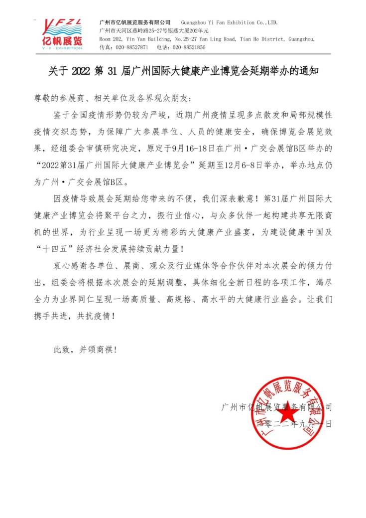 鑒于全國疫情形勢仍較為嚴(yán)峻,近期廣州疫情呈現(xiàn)多點(diǎn)散發(fā)和局部規(guī)模性疫情交織態(tài)勢,為保障廣大參展單位、人員的健康安全,確保博覽會(huì)展覽效果,經(jīng)組委會(huì)審慎研究決定,原定于9月16-18日在廣州·廣交會(huì)展館B區(qū)舉辦的“2022第31屆廣州國際大健康產(chǎn)業(yè)博覽會(huì)”延期至12月6-8日舉辦,舉辦地點(diǎn)仍為廣州·廣交會(huì)展館B區(qū)。