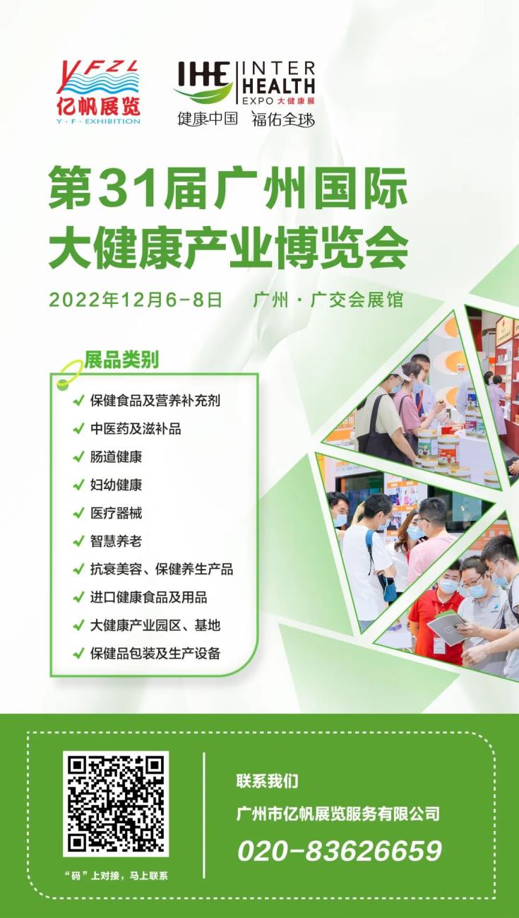 2022第31屆廣州國際大健康產業博覽會,將于12月6日-8日在廣州廣交會展館舉行,展品范圍涵蓋:保健食品以及營養補充劑、中醫藥及滋補品、腸道健康、婦幼健康、醫療器械、智慧養老、抗衰美容、保健養生產品、進口健康食品及用品、保健品包裝及生產設備等十余個專業領域,匯集上千家全球領軍品牌、上萬種健康產品。展會開展在即,我們不見不散!