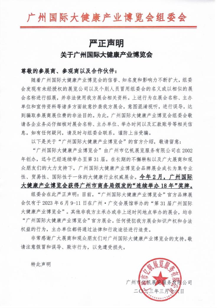 組委會在此嚴(yán)正聲明:目前,“廣州國際大健康產(chǎn)業(yè)博覽會”官方品牌展會僅有于2023年6月9-11日在廣州?廣交會展館舉辦的“第31屆廣州國際大健康產(chǎn)業(yè)博覽會”。其他非我方主承辦或非上述時間地點(diǎn)舉辦的展會,均非“廣州國際大健康產(chǎn)業(yè)博覽會”官方展會。任何侵犯我方展會知識產(chǎn)權(quán)和合法權(quán)益的行為,主辦單位都將通過法律和行政途徑進(jìn)行追責(zé)。