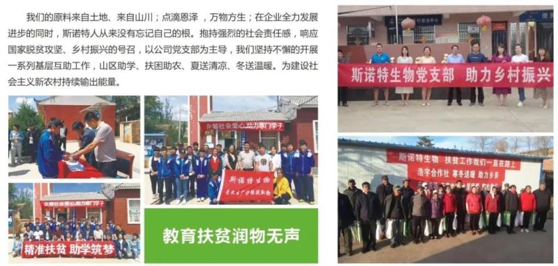產品的原料來自土地、來自山川;點滴恩澤,萬物方生;在企業全力發展進步的同時,斯諾特人從來沒有忘記自己的根。斯諾特抱持強烈的社會責任感,響應國家脫貧攻堅、鄉村振興的號召,以公司黨支部為主導,堅持不懈地開展一系列基層互助工作,山區助學、扶困助農、夏送清涼、冬送溫暖。為建設社會主義新農村持續輸出能量。