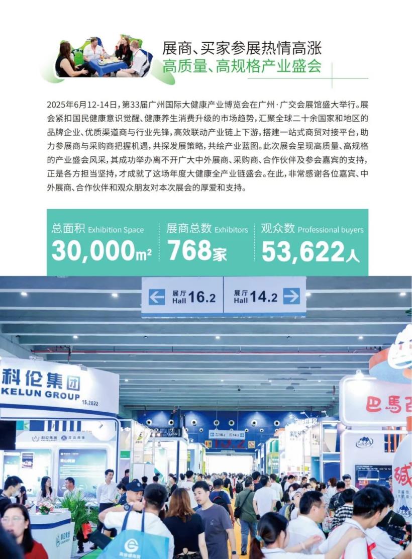 2025年6月12-14日,第33屆廣州國際大健康產業博覽會廣州·廣交會展館盛大舉行。展會緊扣國民健康意識覺醒、健康養生消費升級的市場趨勢,匯聚全球二十余國家和地區的品牌企業、優質渠道商與行業先鋒,高效聯動產業鏈上下游,搭建一站式商貿對接平臺,助力參展商與采購商把握機遇,共探發展策略,共繪產業藍圖。
