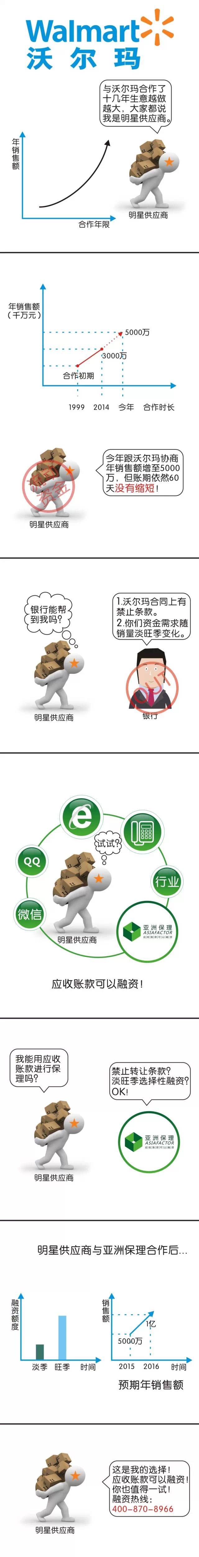 在微信上接觸亞洲保理后,亞洲保理根據目前陳總的實際情況創新地提出解決方案。不僅解決了沃爾瑪禁止轉讓條款的問題,還能夠根據企業的規模調整支持額度,配合銷售淡旺季來選擇性融資,節約了財務的成本的同時還能優化企業的結構!陳總表示:“今年完成五千萬的年營業額,明年朝著一個億的目標前進!”