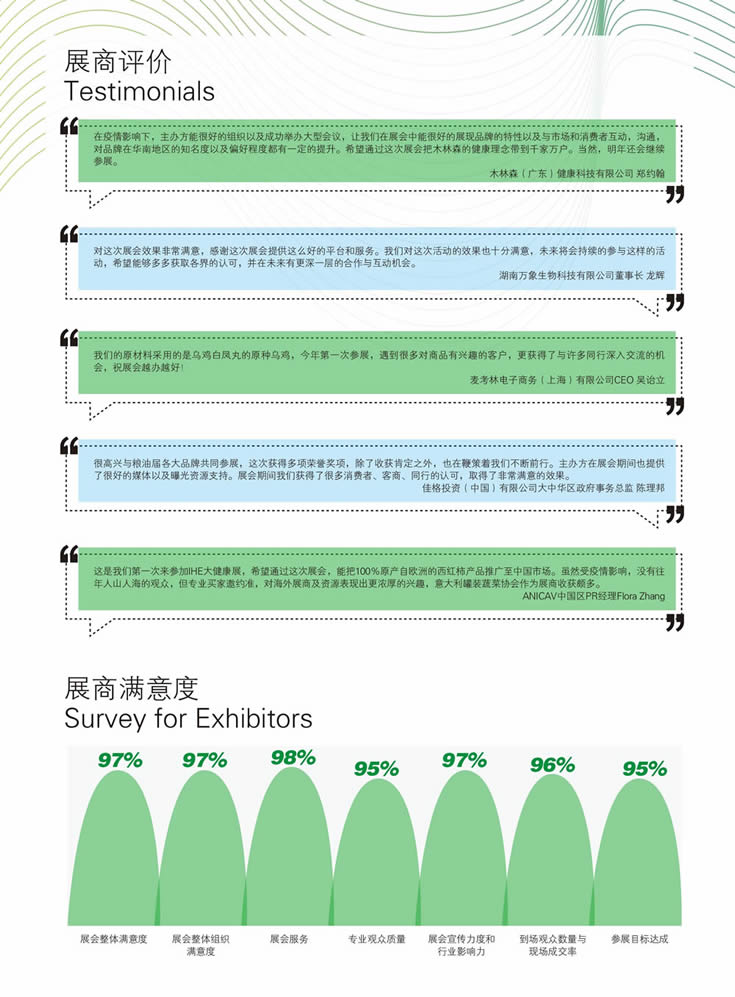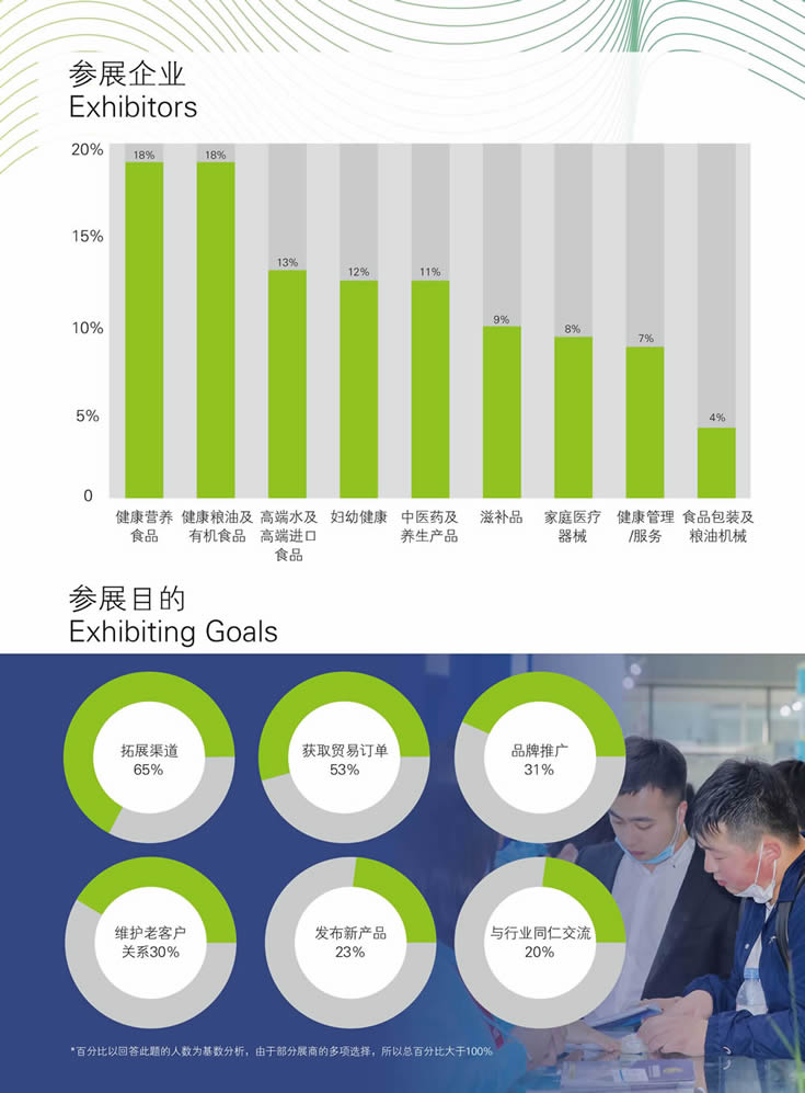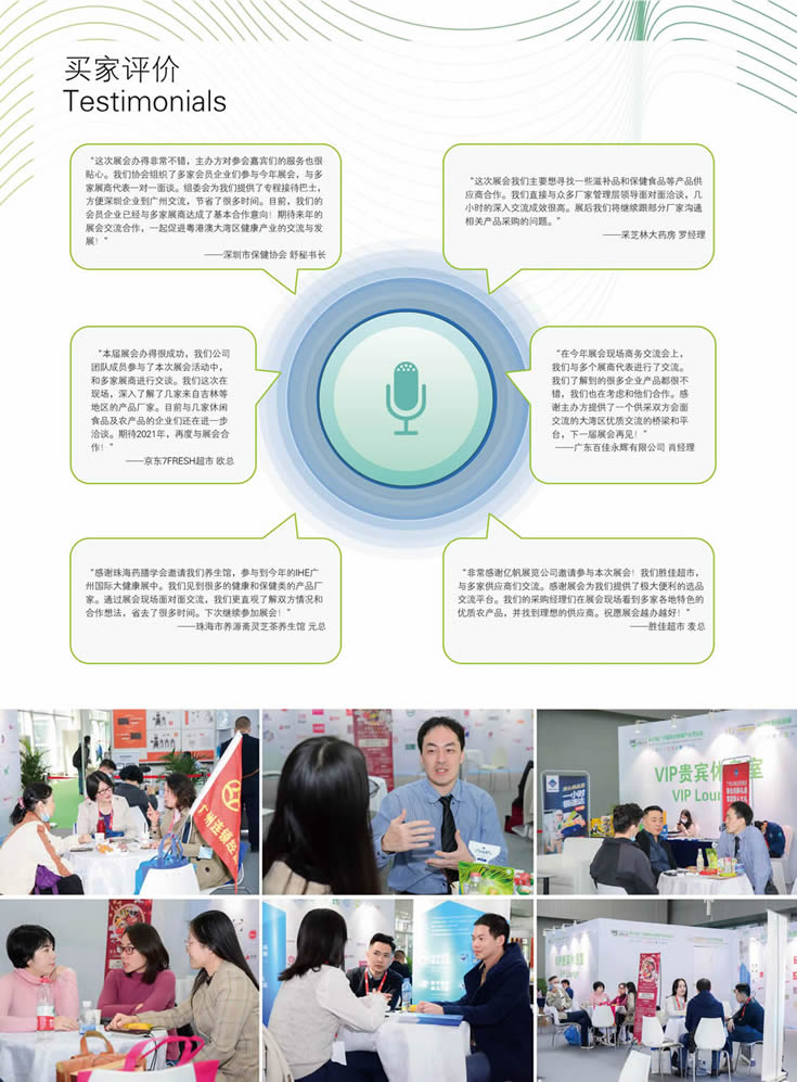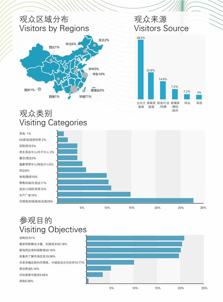 展會吸引了來自海內(nèi)外專業(yè)觀眾、VIP買家20,000余人,其中展會特邀買家500余家, 買家的產(chǎn)業(yè)類別覆蓋了代理商/經(jīng)銷商/批發(fā)商、生產(chǎn)廠家、進出口/國際貿(mào)易、零售終端/專賣店、電商/微商、藥店、健康管理中心/體檢中心、餐飲/酒店、養(yǎng)生美容中心/月子中心、醫(yī)院/醫(yī)生、連鎖經(jīng)營等板塊。