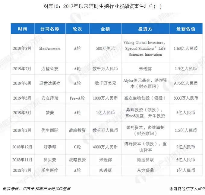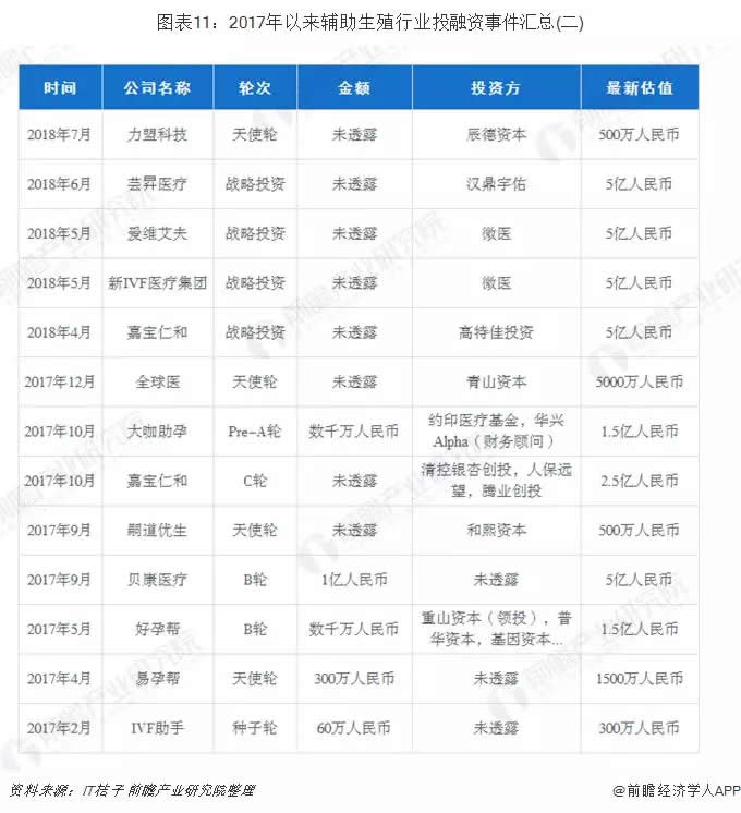 根據(jù)IT桔子統(tǒng)計(jì),2017年以來,輔助生殖行業(yè)投融資事件數(shù)量達(dá)到22起,金額合計(jì)16.01億元,金額最大的一筆為運(yùn)世達(dá)醫(yī)療的A輪融資,規(guī)模達(dá)到數(shù)千萬(wàn)美元,投后估值達(dá)到9.75億人民幣,此次投資方為Alpha美元基金、浩悅資本(財(cái)務(wù)顧問)。