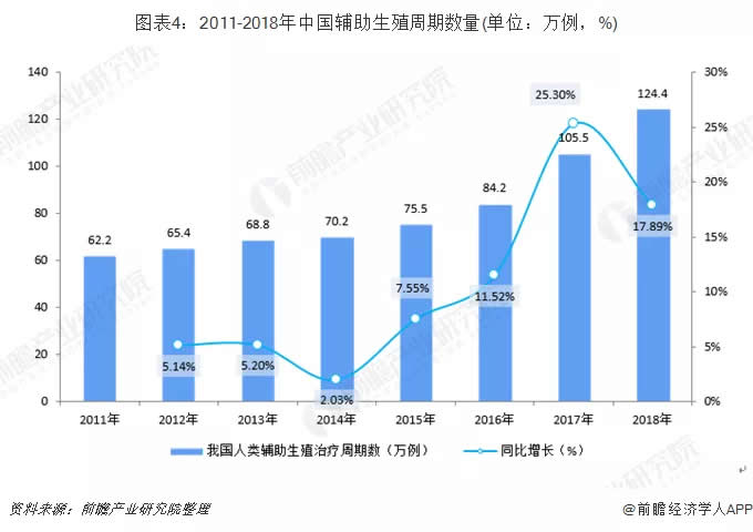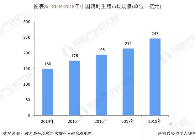 除了影響全球不孕癥的其他因素外,主要是由于環(huán)境污染、工作與生活平衡不良以及其他不健康生活方式因素。由于生育率上升和最近的政府激勵(lì)政策(例如2015年的二胎政策),根據(jù)弗若斯特沙利文數(shù)據(jù)顯示,中國(guó)輔助生殖服務(wù)市場(chǎng)從2014年到2018年以13.6%的復(fù)合年增長(zhǎng)率增長(zhǎng);2018年我國(guó)輔助生殖市場(chǎng)規(guī)模約為247億元。