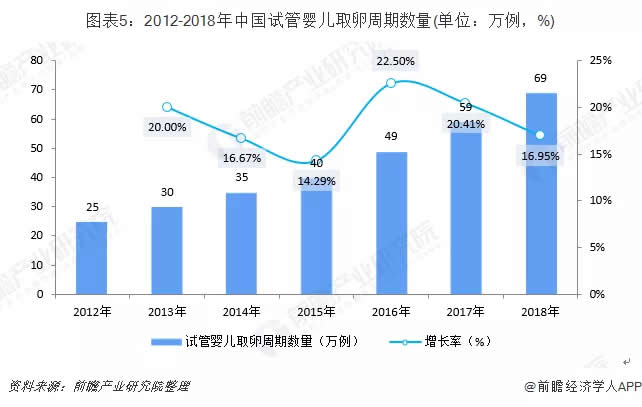 2012-2018年中國(guó)試管嬰兒取卵周期數(shù)量逐年上漲,整體趨勢(shì)變動(dòng)跟輔助生殖周期變動(dòng)情況一致,截止到2018年,中國(guó)試管嬰兒取卵周期數(shù)量達(dá)到69萬(wàn)例,同比上漲了16.95%。