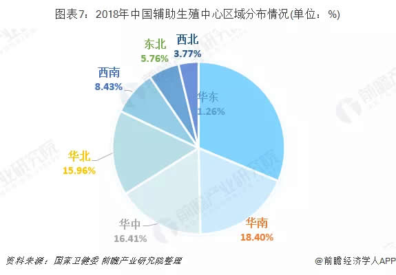 當(dāng)前我國(guó)人類輔助生殖技術(shù)機(jī)構(gòu)主要分布在華東地區(qū),共有156家,占據(jù)31.26%左右的份額,其次為華南、華中及華北地區(qū),分別有92家、82家、79家。可見,當(dāng)前我國(guó)人類輔助生殖行業(yè)的競(jìng)爭(zhēng)狀況與地區(qū)經(jīng)濟(jì)發(fā)展水平息息相關(guān)。
