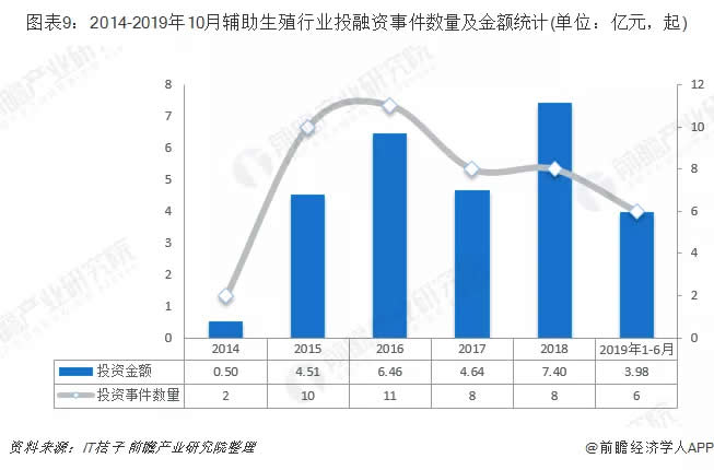 根據(jù)IT桔子統(tǒng)計(jì),以“輔助生殖”為關(guān)鍵詞搜索,從2015年開始,輔助生殖行業(yè)投融資開始爆發(fā),輔助生殖風(fēng)口正式確立,資本迅速涌入。2017年,輔助生殖行業(yè)的投融資事件數(shù)量達(dá)到8起,投融資金額達(dá)到4.64億元;2018年,輔助生殖行業(yè)的投融資事件數(shù)量為8起,投融資金額為7.40億元。2019年截至10月,輔助生殖行業(yè)的投融資事件數(shù)量為6起,投融資金額為3.98億元。
