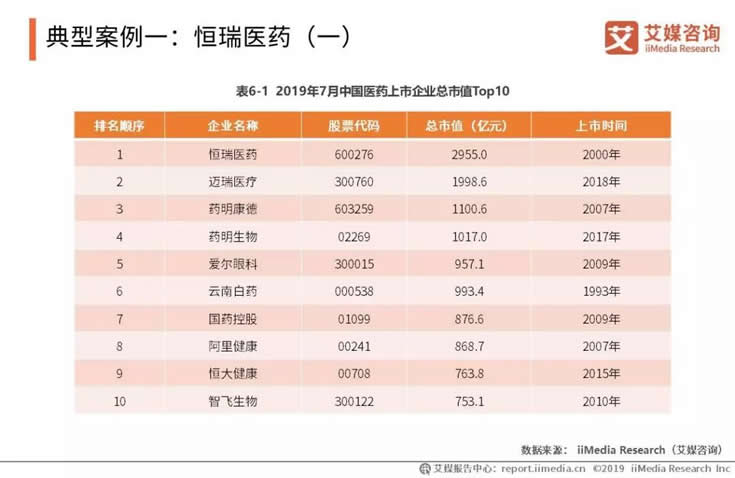 截至2019年7月30日,中國醫(yī)藥上市企業(yè)市值排行榜中,恒瑞醫(yī)藥穩(wěn)居第一,總市值將近3000億元人民幣。艾媒咨詢分析師認(rèn)為,隨著中國對自主研發(fā)科技的關(guān)注度提高,依托技術(shù)的醫(yī)藥企業(yè)的價值獲得資本市場的高度認(rèn)可;特別是科創(chuàng)板的推行,未來幾年將進(jìn)一步利好醫(yī)藥企業(yè)上市。