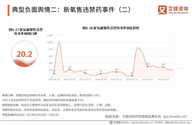 據(jù)艾媒商情輿情數(shù)據(jù)監(jiān)測系統(tǒng)顯示,在2019年6月30日,有消費(fèi)者投訴新氧推薦違規(guī)醫(yī)美機(jī)構(gòu)致整容失敗,#新氧App黑心推薦致妙齡女子毀容#話題登上微博熱搜,引起了網(wǎng)民的高度關(guān)注,輿論熱度達(dá)到頂峰。到7月15日,新京報發(fā)布報道《新氧APP商家涉售違禁藥,“變美日記”可造假》,新氧輿論熱度迅速上升,再次陷入管控失格輿論風(fēng)波。網(wǎng)絡(luò)口碑值為20.2,表明網(wǎng)民對事件抱有較強(qiáng)的負(fù)面態(tài)度。
