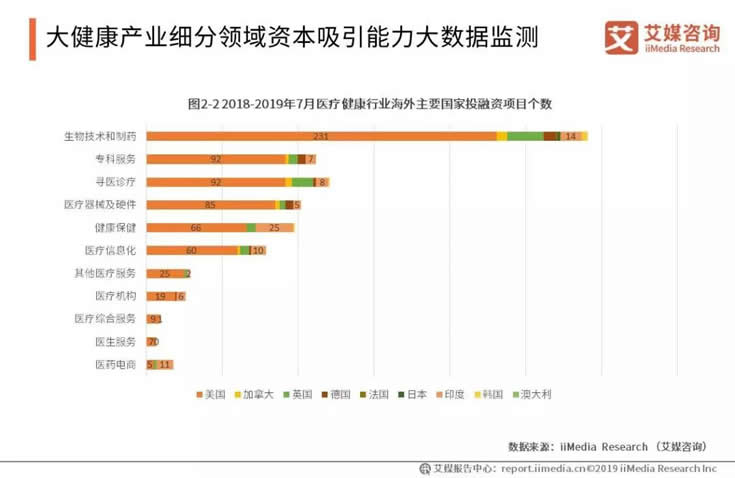 2018-2019年大健康產(chǎn)業(yè)的境外投資中,美國在各領(lǐng)域都占最大的比重。