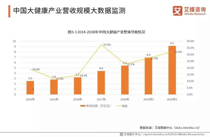 2014年到2018年,中國的大健康產(chǎn)業(yè)整體營收保持增長,2018年營收規(guī)模超過5萬億元,預(yù)計2020年將超過9萬億元,增幅達(dá)32.1%。艾媒咨詢分析師認(rèn)為,中國與全球的大健康產(chǎn)業(yè)發(fā)展情況基本一致,同樣由于社會結(jié)構(gòu)變化而需求不斷增長,具有可持續(xù)增長性。