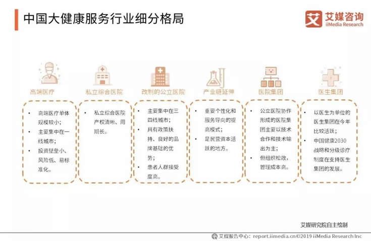 投融資數(shù)據(jù)已顯示,除了生物技術(shù)與硬件設(shè)備高資金密集度的領(lǐng)域,社會需求和資本都在向?qū)I(yè)化的醫(yī)療服務(wù)傾斜。在目前中國大健康服務(wù)行業(yè)中,可以分為六大板塊。