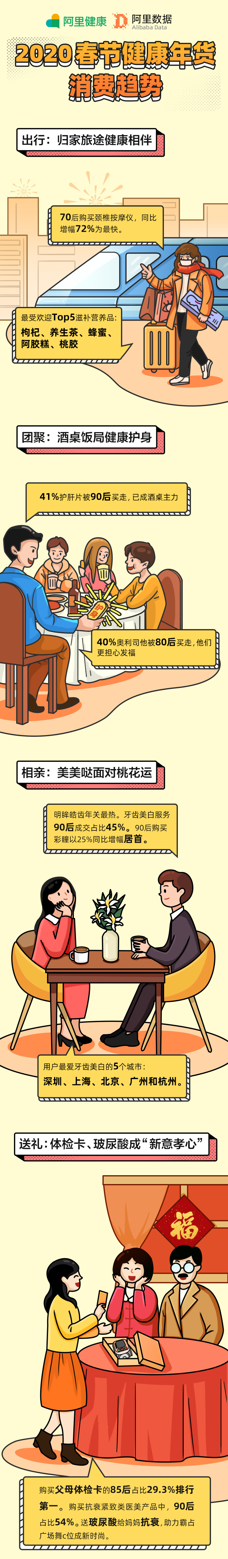 隨著年味兒漸濃,網購年貨也進入高峰期,健康領域的消費有什么新變化?1月8日,阿里健康聯合阿里數據,就阿里電商平臺年貨消費數據發布《春節健康年貨消費趨勢》。數據顯示,鼠年春節,無論出行、團聚還是送禮,各年齡段人群在健康消費上都更愿意花錢了,而“惜命”的90后更成為健康購物主力擔當。