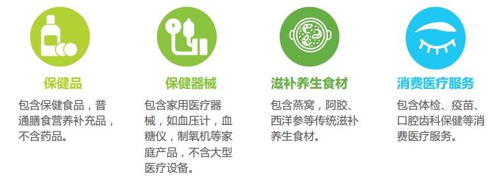 大健康消費主要包括以下四個方面:一是保健品,二是保健器械,三是滋補養生食材,四是消費醫療服務。