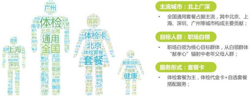 伴隨著北上廣深白領人群工作生活的較大壓力,體驗服務尤其是體檢套餐服務已然常態化,定期給自己一份健康的答卷是白領高雅工作之余的慰藉。同時隨著父母家人年齡漸大,在送禮不如送健康的市場宣導下,體驗卡套餐的服務形式已被成功孵化并輻射至中老年客戶群。