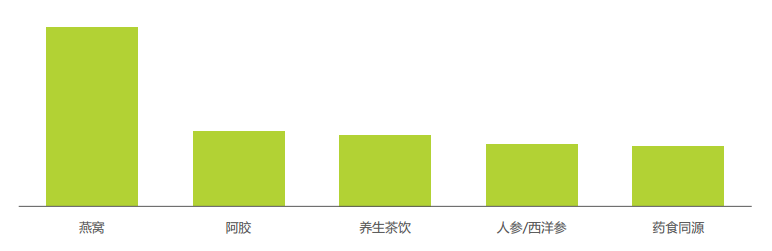 低齡化用戶引領國潮保健消費增長,16-25歲的用戶成交額占比從5.3%升至6.0%,16-25歲的用戶成交額同比增長36.9%。燕窩、阿膠、養生茶為滋補食材類產品增長提供強勢驅動力。在滋補養生類目中,燕窩成交額占比接近三成,獨占鰲頭;阿膠、養生茶飲、人參/西洋參等成交額也超過類目的一成。