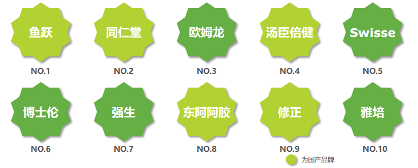 國潮風吹遍保健領域,國產品牌強勢支撐大健康產品市場。大健康產品領域中,專注于醫療器械的魚躍和傳統國藥老字號的同仁堂占據著TOP2位置。