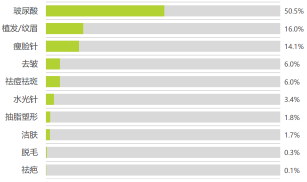 醫美服務市場接受程度快速提高。玻尿酸、植發/紋眉、瘦臉類塑形服務合計占據8成市場份額。其中玻尿酸成為當之無愧的美容塑形爆款產品,單品年度成交額占比已超過50%,成交額占比在10%以上的美容塑形產品服務,除玻尿酸外則有植發/紋眉及瘦臉針, 三者銷售份額合計超過80%。