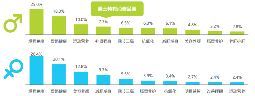 男士運動強身訴求集中,女士保健訴求多樣化:增強免疫與骨骼健康是群體消費共性,“補腎強身”,“養肝護肝”則是男性特有的消費品類,成交額分別占比7.7%與2.8%,“美容養顏”與“減肥塑身”兩類產品在女性保健品類中消費占據前五。