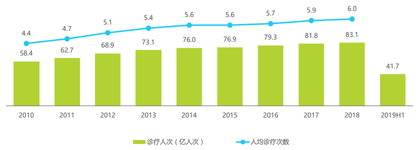 2010-2019H1中國年診療人次及人均診療次數