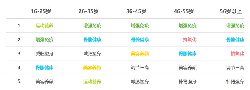 2019年中國各年齡段用戶保健品消費TOP5類型