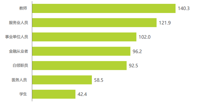 這類消費者的年齡段主要集中在26-45歲,其中66.1%處于已婚狀態,90.3%的用戶購買力歸屬為中等或高收入人群。其中教師、服務人員對緩解疲勞類保健品的消費需求更高。教師、服務業人員、事業單位人員成為核心焦慮群體,其在緩解疲勞類保健品目標人群指數分別高達140.3、121.9及102.0,在整體人群當中表現突出,而經濟能力尚未成熟的學生則TGI指數表現略低。