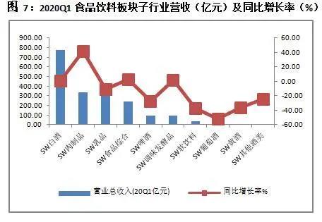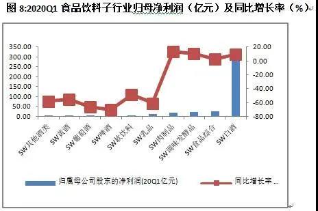 2020年第一季度,盡管受疫情影響,但受益于龍頭公司的強勁表現,食品飲料行業仍力保營收基本持平,實現營業收入合計1917.94億元,同比增長0.21%;實現歸母凈利潤390.7人億元,同比下降0.66%。