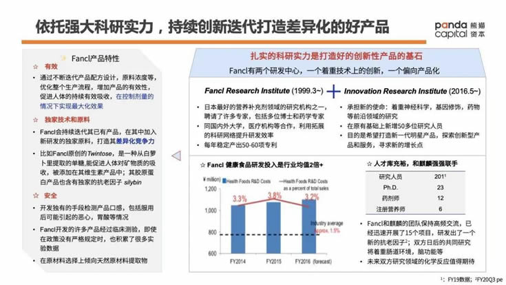 扎實的科研實力是打造好的創新性產品的基石。Fancl非常重視研發,共有兩個研發中心,一個側重技術創新和探索,一個側重產品化,每年穩定產出50-60項專利。橫濱Fancl綜合研究所是日本最好的營養補充劑領域的研究機構之一。同時,Fancl積極同國內外大學,醫療機構等開展合作,利用拓展的科研網絡提升研發效率。尤其在和麒麟聯手后,雙方打通研發體系,互相激發,研究進展很快。