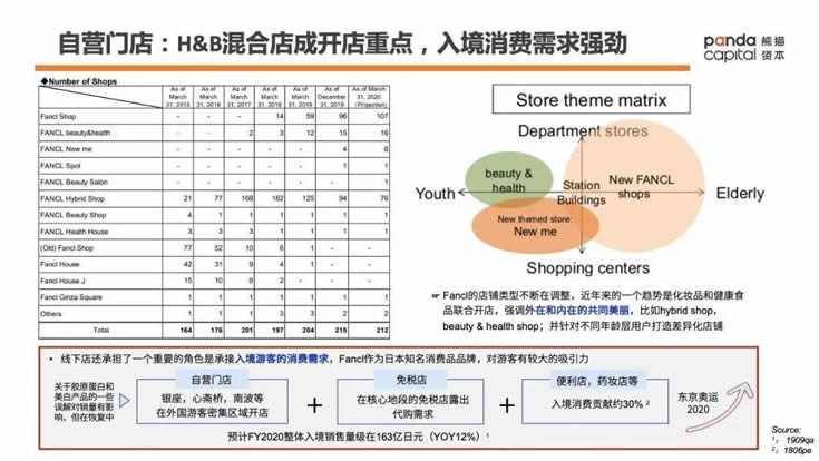 目前Fancl不僅是在自營門店,還在免稅店、藥妝店、便利店等渠道均有銷售和品牌露出。藥妝店、便利店等地方的入境消費貢獻了約30%的收入。